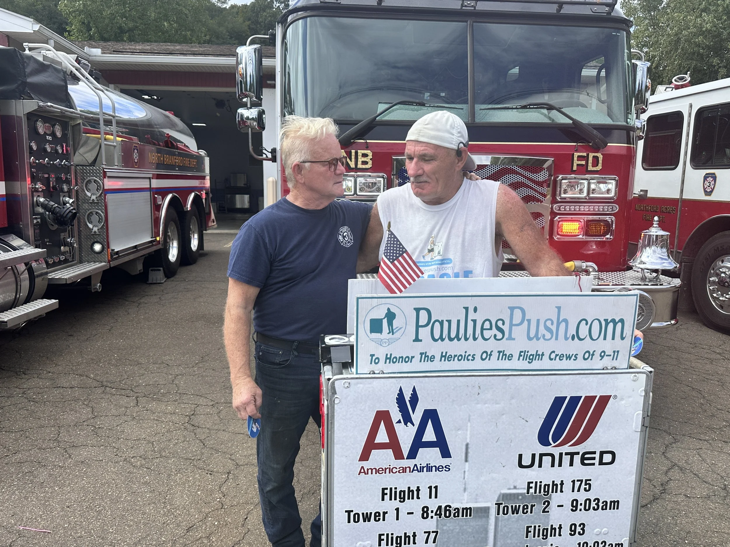 He will likely be escorted by the Durham Fire Department, who will hand escort duties off to North Branford Company 3, located at 1958 Middletown Ave, Northford, CT 06472. He will make a brief stop at the station, and members of the public are welcome to meet him there. From there, North Branford Fire Department plans a full escort —including fire apparatus and community members—to accompany Paulie the remainder of the way to Company 2, located at 1370 Middletown Ave, Northford, where members of the fire department, police department, and town representatives will join him. Here members of the public should have the opportunity to view, be photographed with, and push Paulie’s cart, as well as the four carts decorated for each of the four hijacked flights.